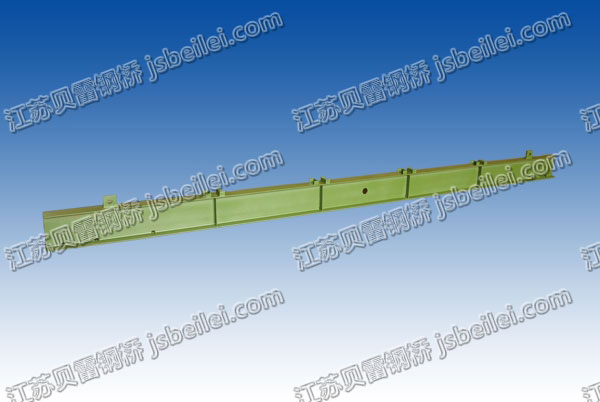 用(yong)(yong)27號壓延工字鋼制成,在頂部(bu)焊(han)(han)有4個卡(ka)鐵,用(yong)(yong)以限定(ding)縱梁(liang)的(de)位置(zhi),兩(liang)端(duan)(duan)上方焊(han)(han)有一個帶圓孔的(de)短方柱,用(yong)(yong)來固(gu)定(ding)斜撐,兩(liang)端(duan)(duan)底部(bu)各有3個凹眼,用(yong)(yong)以套入桁架下弦桿橫(heng)梁(liang)墊板(ban)上的(de)定(ding)位栓釘,使橫(heng)梁(liang)在桁架上就位,在兩(liang)端(duan)(duan)腹板(ban)兩(liang)側(ce)距端(duan)(duan)面25cm的(de)位置(zhi)各焊(han)(han)有一個銷釘,用(yong)(yong)以固(gu)定(ding)人行道的(de)挑(tiao)梁(liang)。