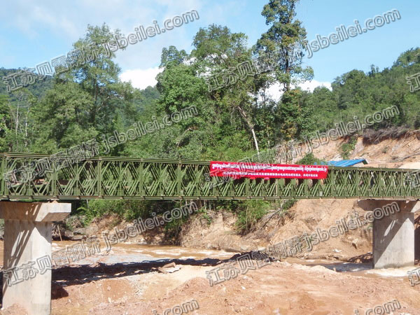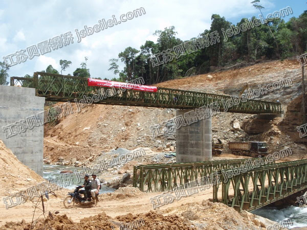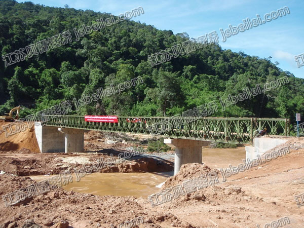 柬埔寨額(e)樂(le)塞水電站貝雷橋采用(yong)200型雙排(pai)單層(ceng)加強(qiang)型組排(pai)設計。此貝雷橋(qiao)為單車道,橋(qiao)寬(kuan)4.2米(mi)(mi)(mi),可(ke)承(cheng)載42噸。橋(qiao)長60.96米(mi)(mi)(mi),三(san)跨,兩端12.192米(mi)(mi)(mi)一跨,中間(jian)跨度為36.576米(mi)(mi)(mi)。