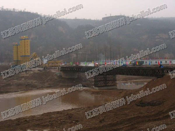 隴南貝雷鋼橋 100型三(san)排單(dan)層加強下(xia)承(cheng)式貝雷橋(qiao), 橋(qiao)長54米,兩(liang)跨:每跨27米。中間(jian)橋(qiao)柱同樣由貝雷片(pian)組裝(zhuang)構成。